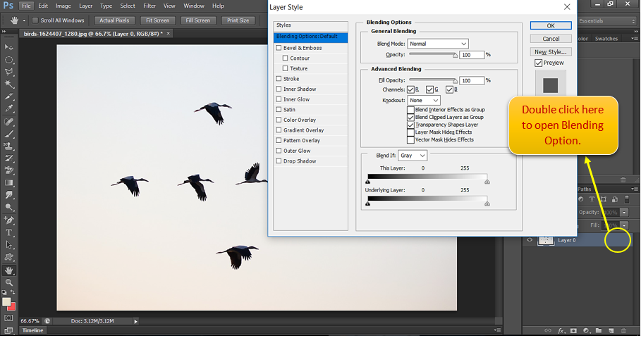 We adjust the “Blend If” in Blending option. We adjust the slider of “Blend If” as shown in below picture. Here Gray is selected in Blend If value. Whatever shades of Gray falls outside the slider will be wiped off the current layer.