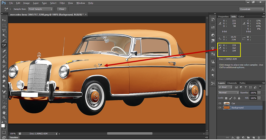 Let’s open below image in Photoshop application. Here, we will have two layers - one background layer with a color and another car image with transparent background.